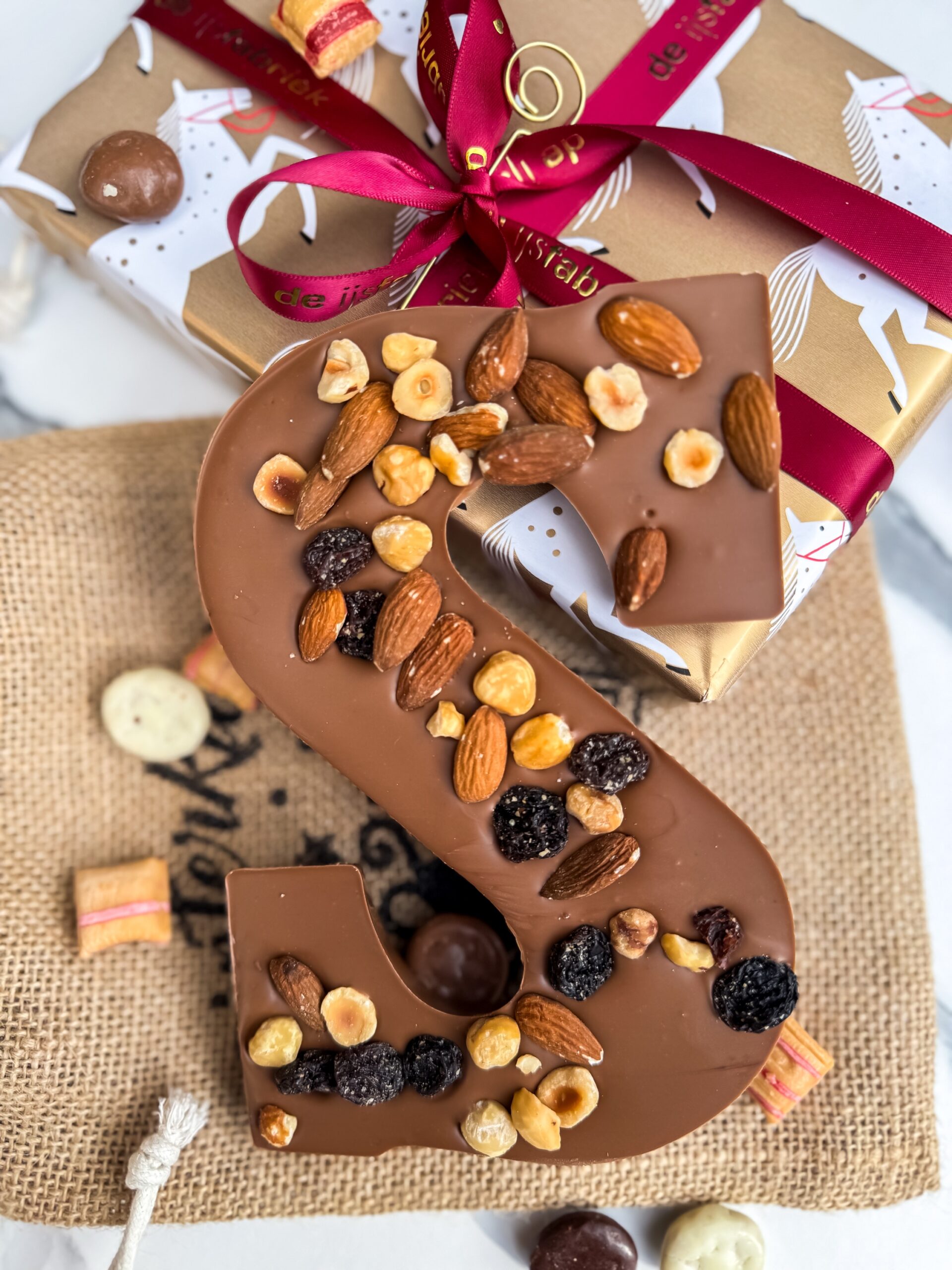 Dit huisje is gevuld met 340 gram Sinterklaas chocolade bestaande uit klompjes, mini lettertjes, sintjes en pietjes en 1 marsepein figuurtje